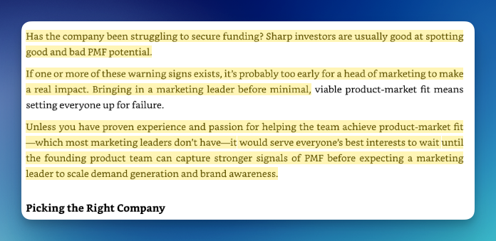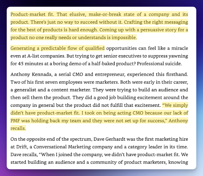One of the book’s more discouraging assertions is that marketers should avoid companies without product–market fit—that joining a pre-PMF team is career risk. The implication is that marketers should wait for the product to “work” before participating in its story.