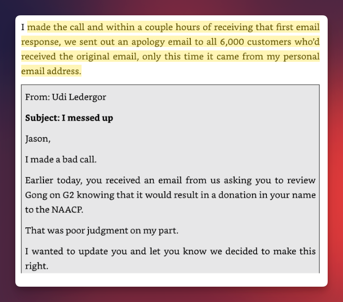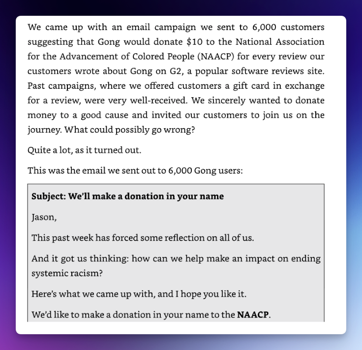Midway through the book lies a case study that reveals its most unsettling blind spot: an email campaign launched in the days following the murder of George Floyd. The company promised to donate $10 to the NAACP for every new review posted on G2. The response, predictably, was swift and negative—from customers, investors, and the broader community. An apology email followed, beginning with “I messed up.”