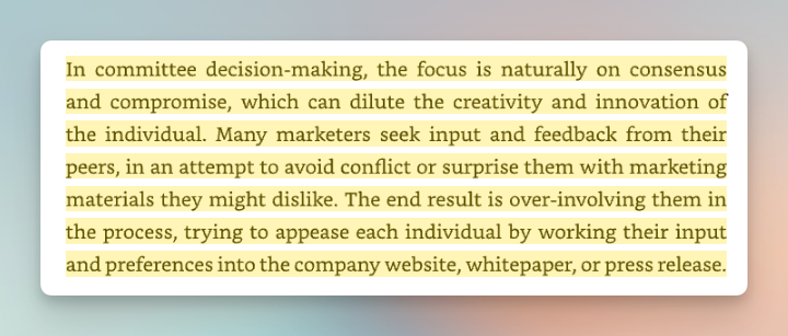 One of the early warnings in the book is about “committee-based marketing,” illustrated with the observation that consensus tends to dilute creative boldness. As the text notes, “the focus is naturally on consensus and compromise,” and over-involving stakeholders leads to “appeasing each individual by watering their input” into mediocrity.