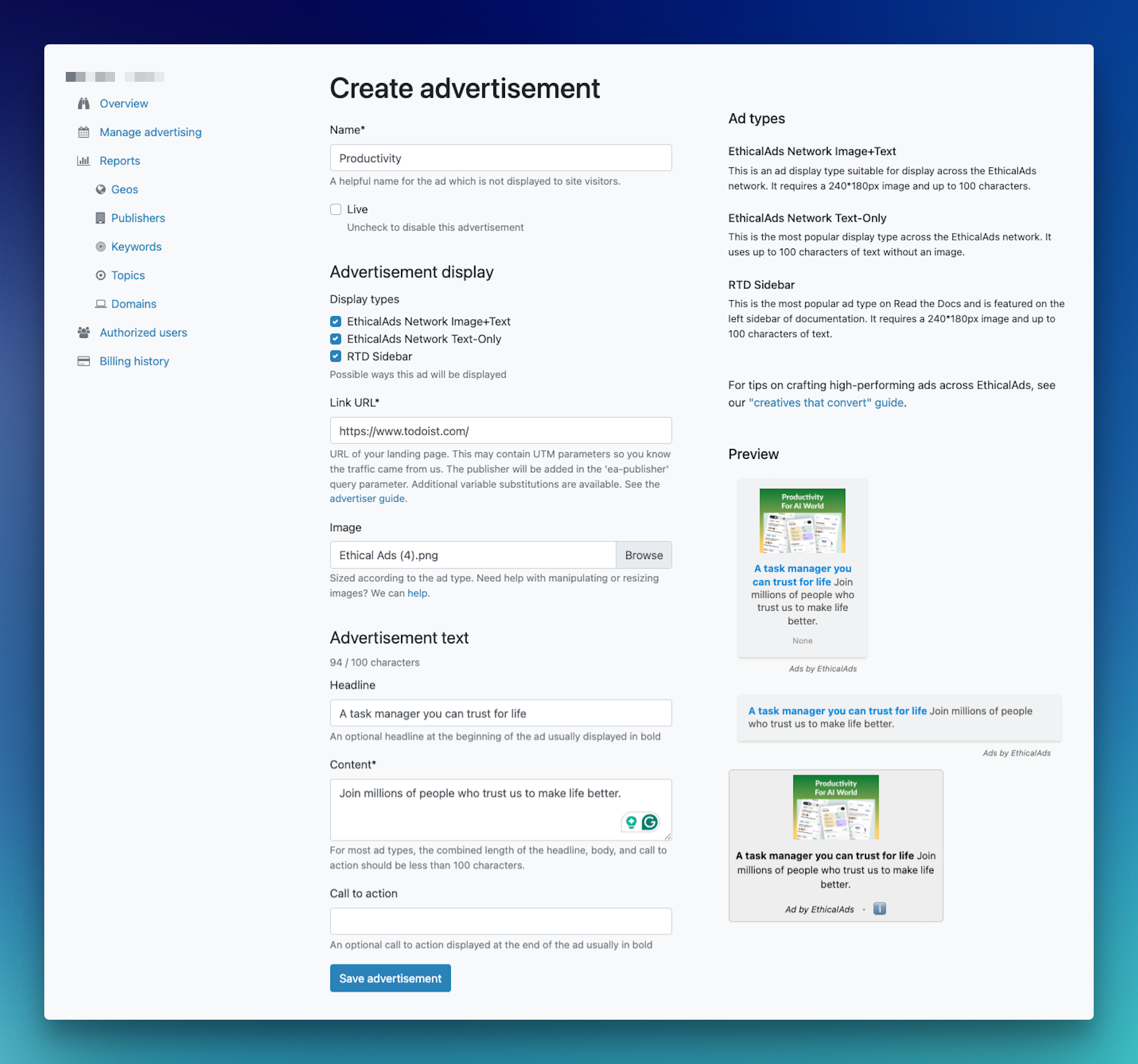 2. Submit your request. EthicalAds will email you a link to your personal ad portal.