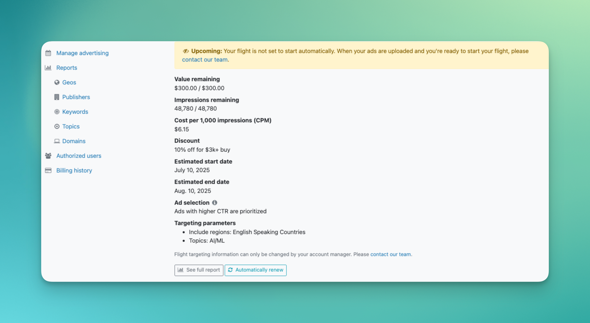 3. In this portal, campaigns are called “flights.” A flight is a campaign with set start and end dates, budget, targeting, and ads.