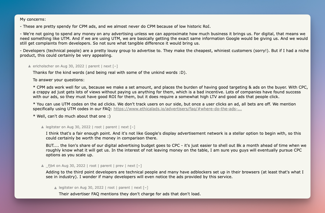 Keep these points in mind when planning your EthicalAds campaigns. If you have questions or want to start, reach out directly to their team for support and next steps.