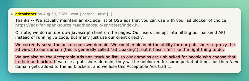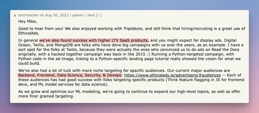 This search led us to EthicalAds, a platform that lets us run experiments and advertise specifically to developers.