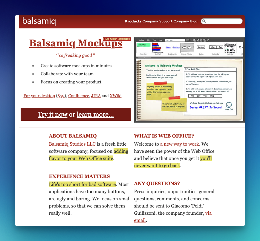 Balsamiq website from early 2009 to present. The promise they kept for more than a decade, and that is trust.