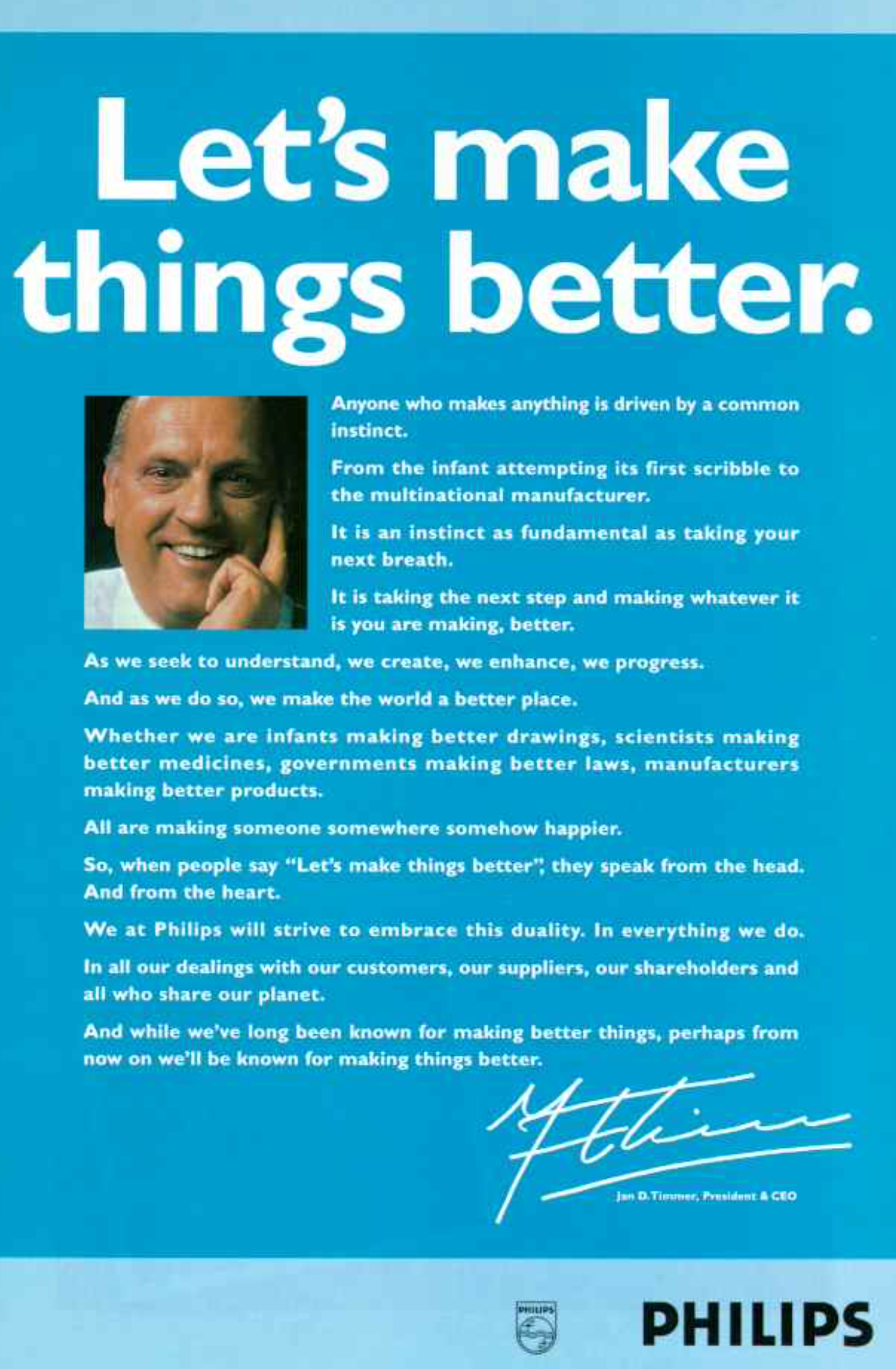 - Philips’ “Let’s Make Things Better” master brand campaign began globally in 1995, aiming to unify disparate product lines under one optimistic innovation promise.