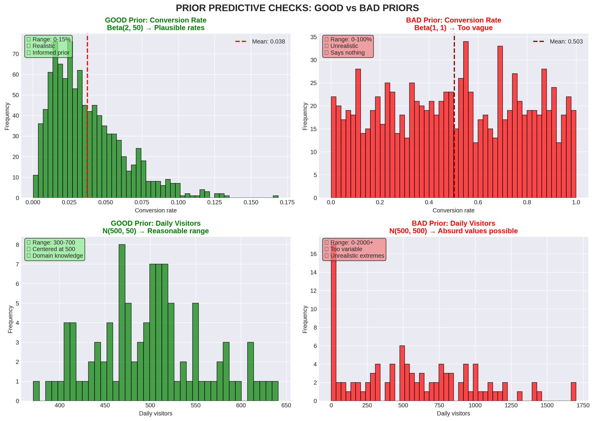 - If average conversion rate is 3-5% historically, use Beta(3, 97) prior