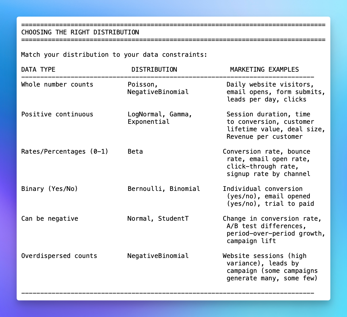 - ALWAYS choose distributions matching your data constraints - Count data needs count distributions, positive data needs positive distributions.