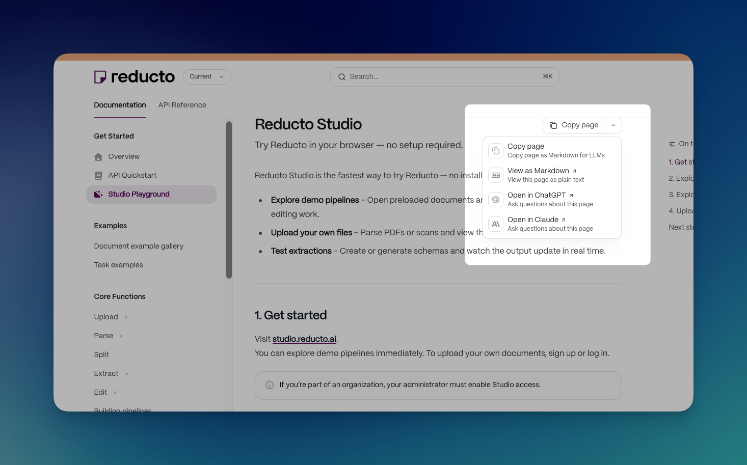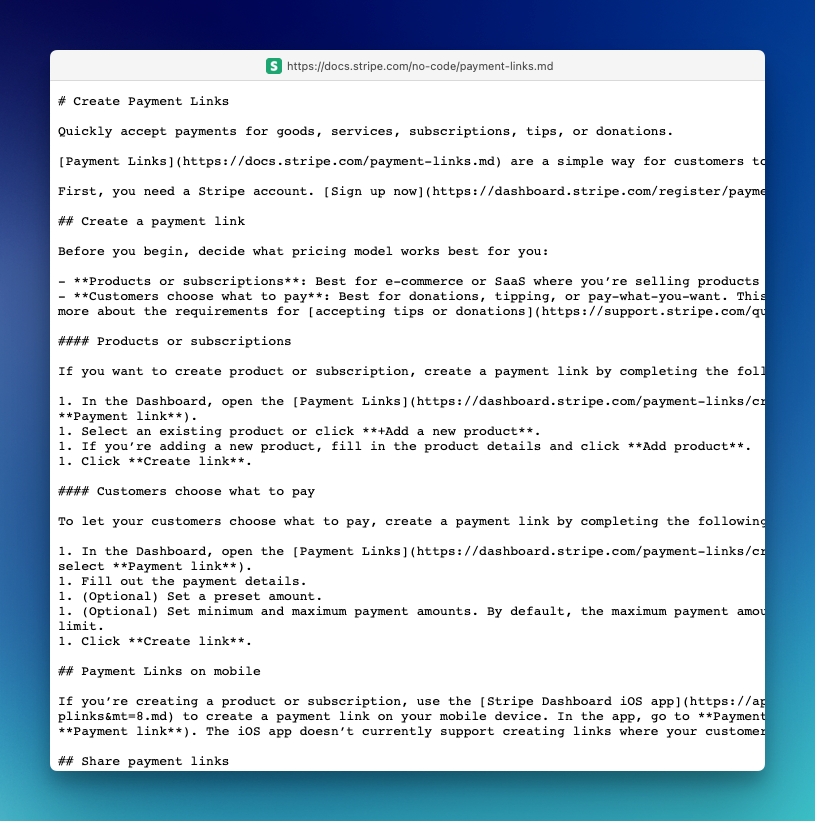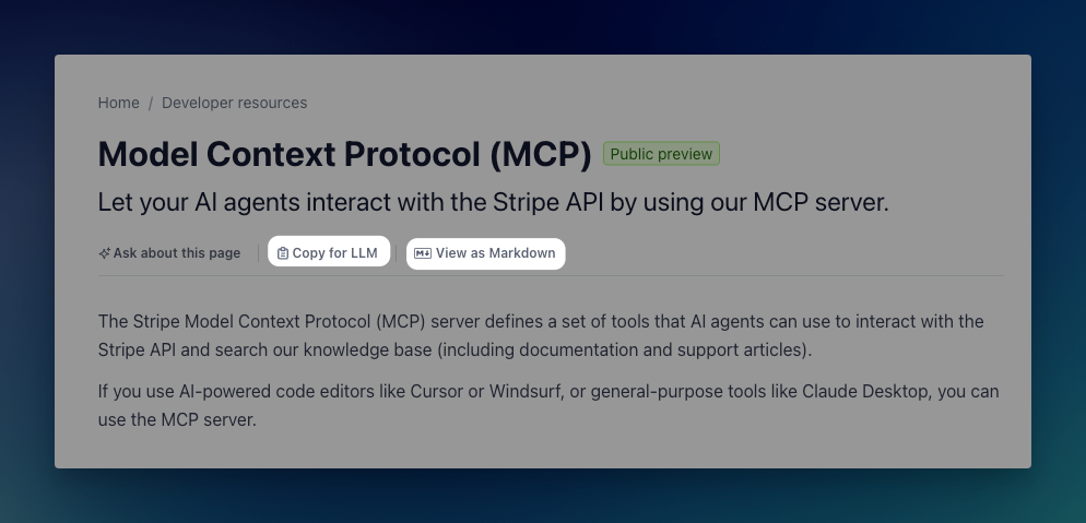 On Stripe's documentation page, you will notice there are two different links. One is a Copy for LLM, and the other is view as markdown.
