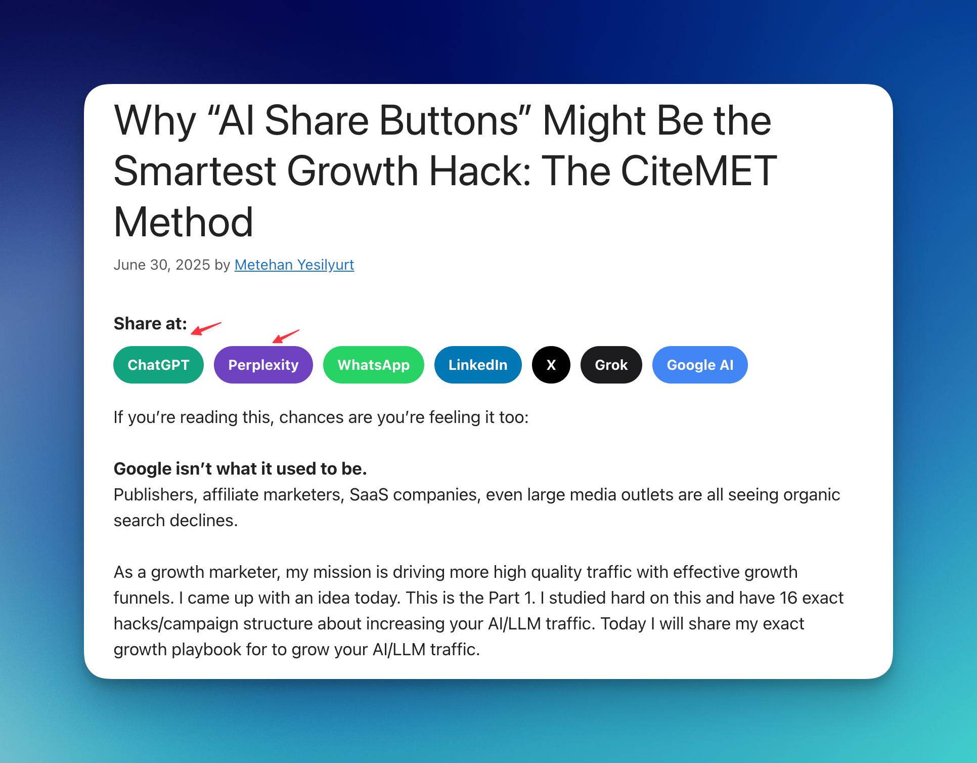 Blogs now have "Share with AI" buttons (like Share with ChatGPT or Perplexity) next to the usual social media buttons. When clicked, these buttons send a pre-written prompt to the AI, asking it to summarize the page and remember the URL for future reference. It’s a bit like submitting your site to Google Search Console so it gets indexed—except here, you’re helping AI models "index" your content in their memory. A smart SEO hack.