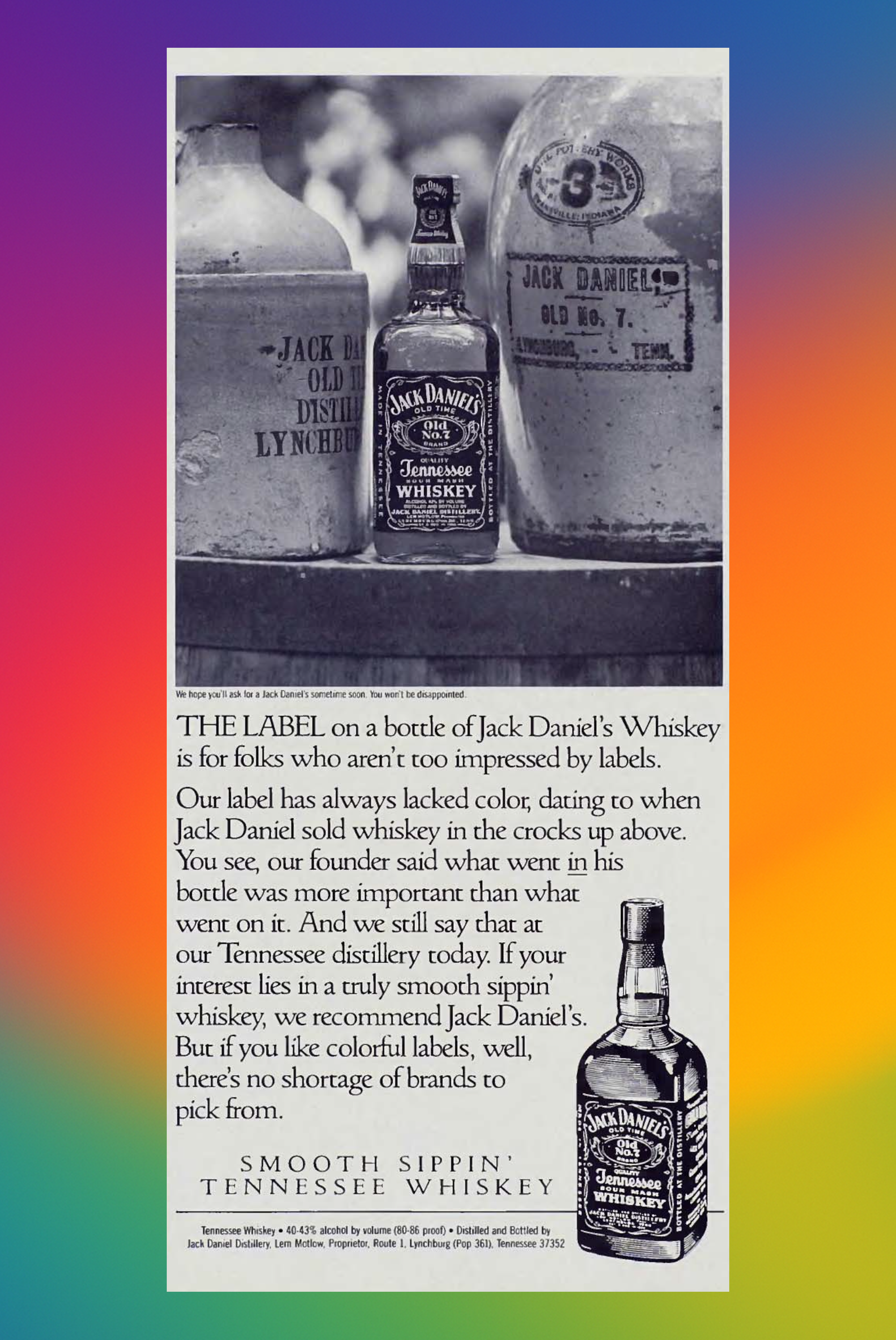 THE LABEL on a bottle of Jack Daniel's Whiskey is for folks who aren't too impressed by labels. Our label has always lacked color, dating to when Jack Daniel sold whiskey in the crocks up above. You see, our founder said what went in his bottle was more important than what went on it. And we still say that at our Tennessee distillery today. If your interest lies in a truly smooth sippin' whiskey, we recommend Jack Daniel's. But if you like colorful labels, well, there's no shortage of brands to pick from.